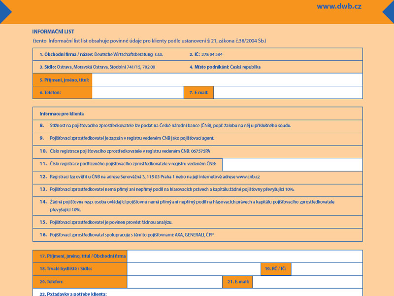 Společnost DWB se zabývá nezávislým finančním a investičním poradenstvím, které klientům usnadňuje výběr správného produktu na finančním trhu, ať už v oblasti pojištění či správy osobních financí a investic.