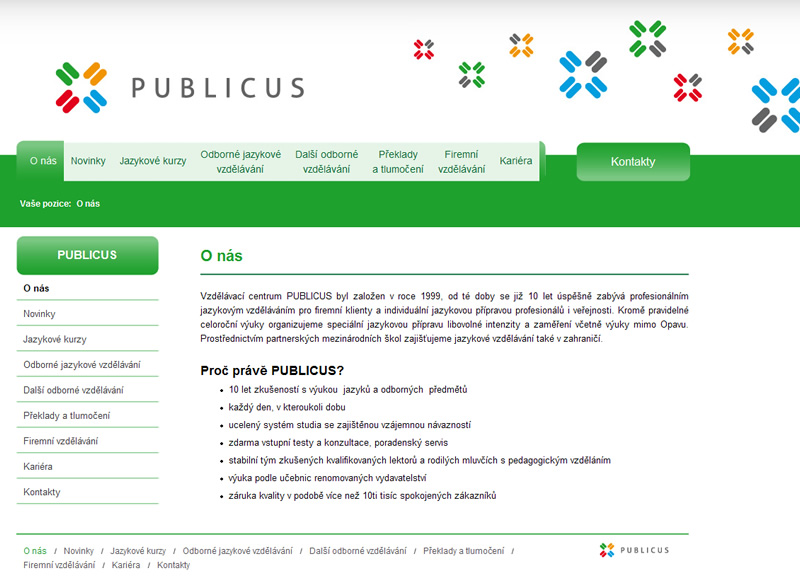 Pro společnost PUBLICUS jsme navrhli nový vizuální styl včetně loga. Na základě tohoto vizuálního stylu jsme vytvořili rozsáhlou internetovou prezentaci, která obsahově pokrývá celé spektrum služeb vzdělávacího centra.